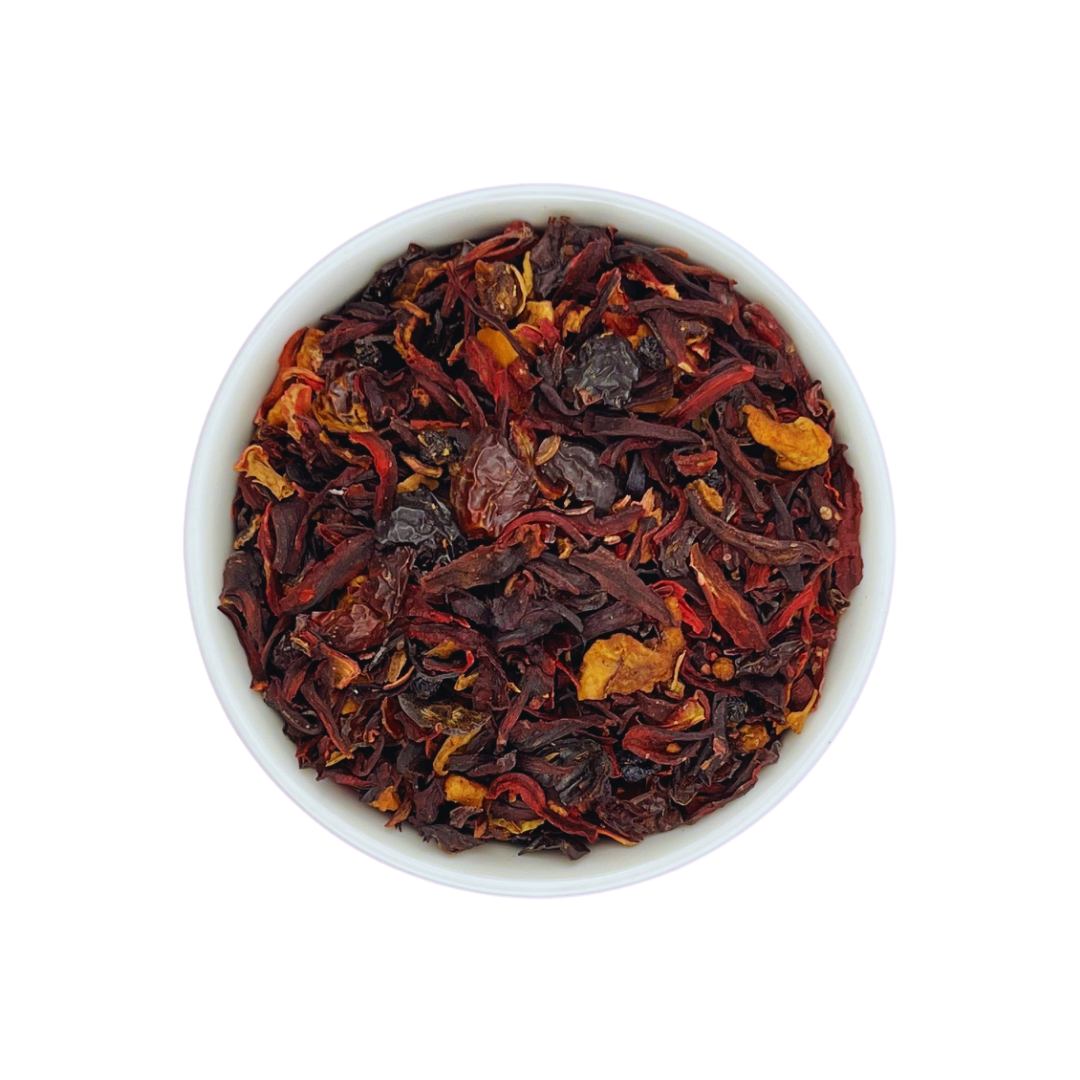 Hibiscus, Rose Hip Peel, Apple Pieces, Elderberries, Plum Pieces, Cinnamon Pieces, Star Anise, Flavoring.
