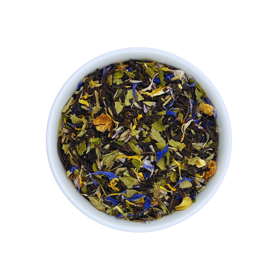 Black Tea, Lavender Blossoms, Eucalyptus Leaves, Orange Peel, Peppermint, Lemon Peel, Moringa Leaves, Cornflower Blossoms, Marigold Blossoms, Lime Oil, PeppermintOil, Eucalyptus Oil.
